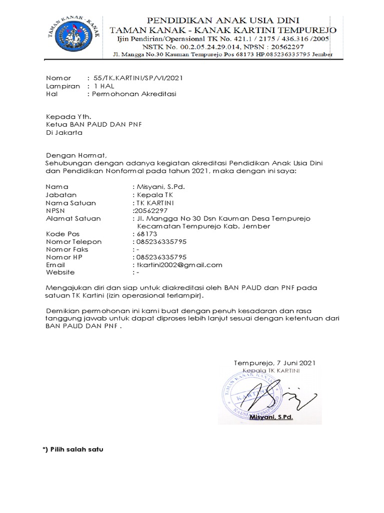 Surat Permohonan Akreditasi Paud Dan Pnf Tahun 2022 Maxtrimus